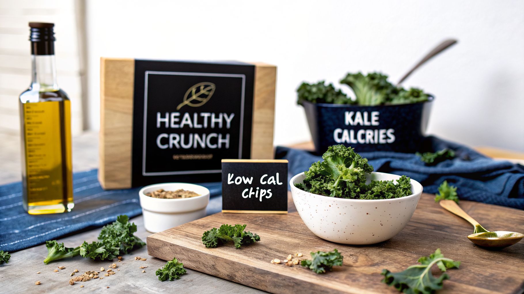 Even store-bought kale chips are a solid choice. A typical commercial brand might have around 140 calories per serving, but they often come with a good dose of protein (5g) and fiber (2g). This makes them a fantastic alternative in the salty snack aisle, where most options offer little more than salt and fat. You can find detailed nutritional data on commercial kale chips to compare different brands.